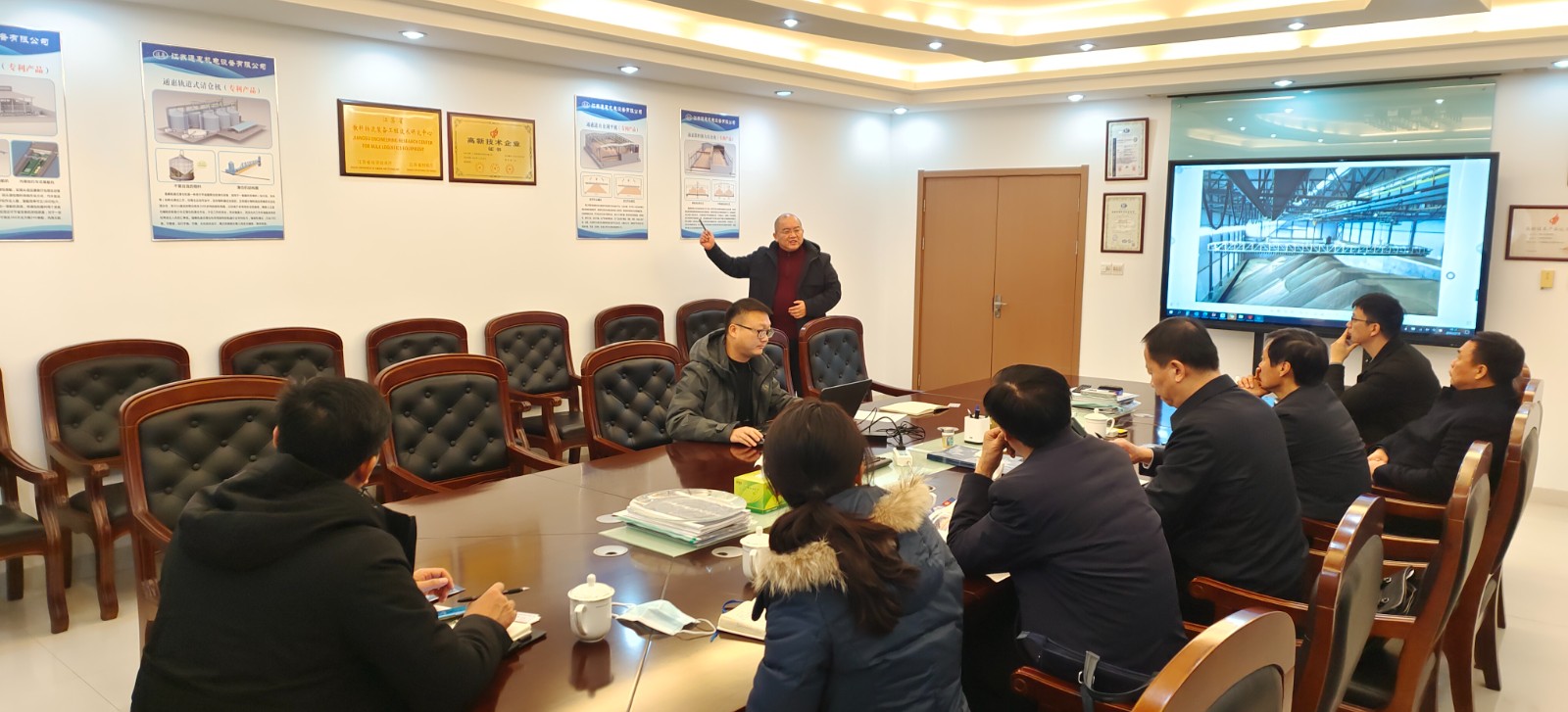 2022年2月10日,新年開工伊始,江蘇省泰州市海陵區(qū)政府領(lǐng)導(dǎo)團(tuán)蒞臨江蘇通惠參觀考察,同時(shí)了解我公司產(chǎn)品——立筒倉臥式軌道清倉機(jī)、房式倉刮平機(jī)、房式倉散料強(qiáng)力出倉機(jī)、袋包裝船機(jī)、內(nèi)港池式袋包散料二合一裝船機(jī)等。